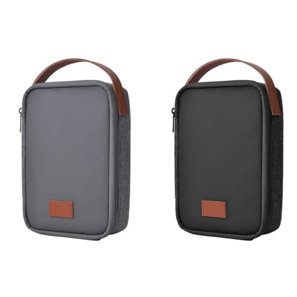 Water resistant material Mini Pouch with leather handle. Has large capacity storage and adjustable divider pad. Product Size: 21×15.5x5cm. Packaging: Paper box